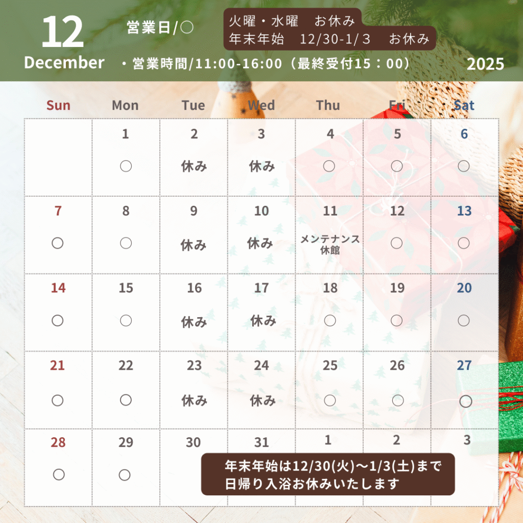 【12月】日帰り入浴営業日のご案内
